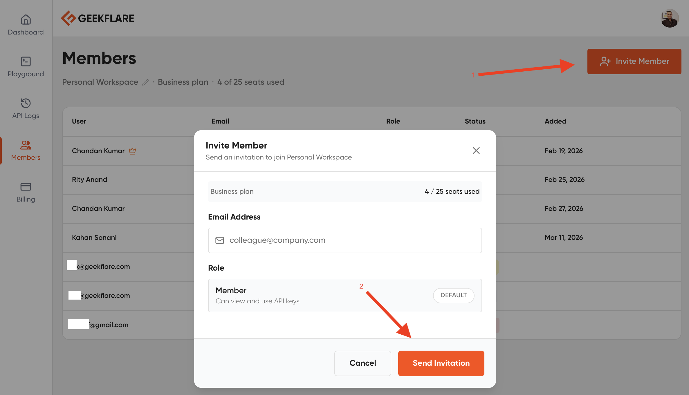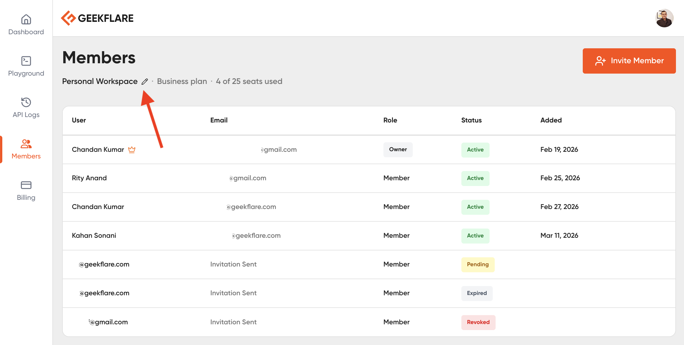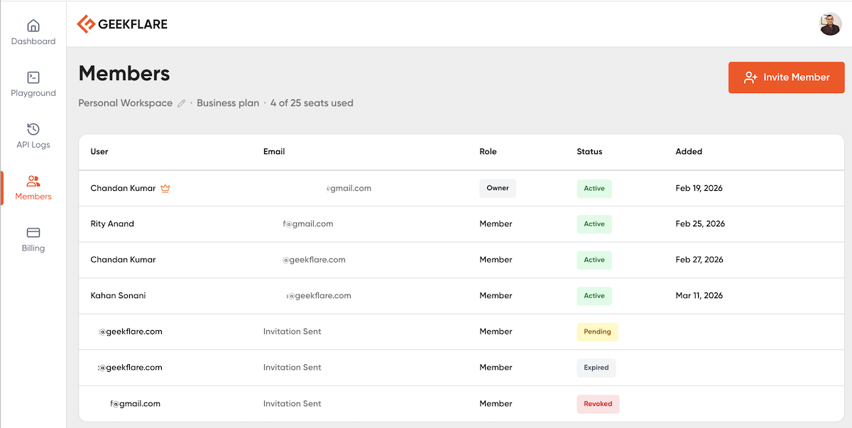 To manage your team, log in to the Geekflare API Dashboard and click on the Members tab in the left sidebar.